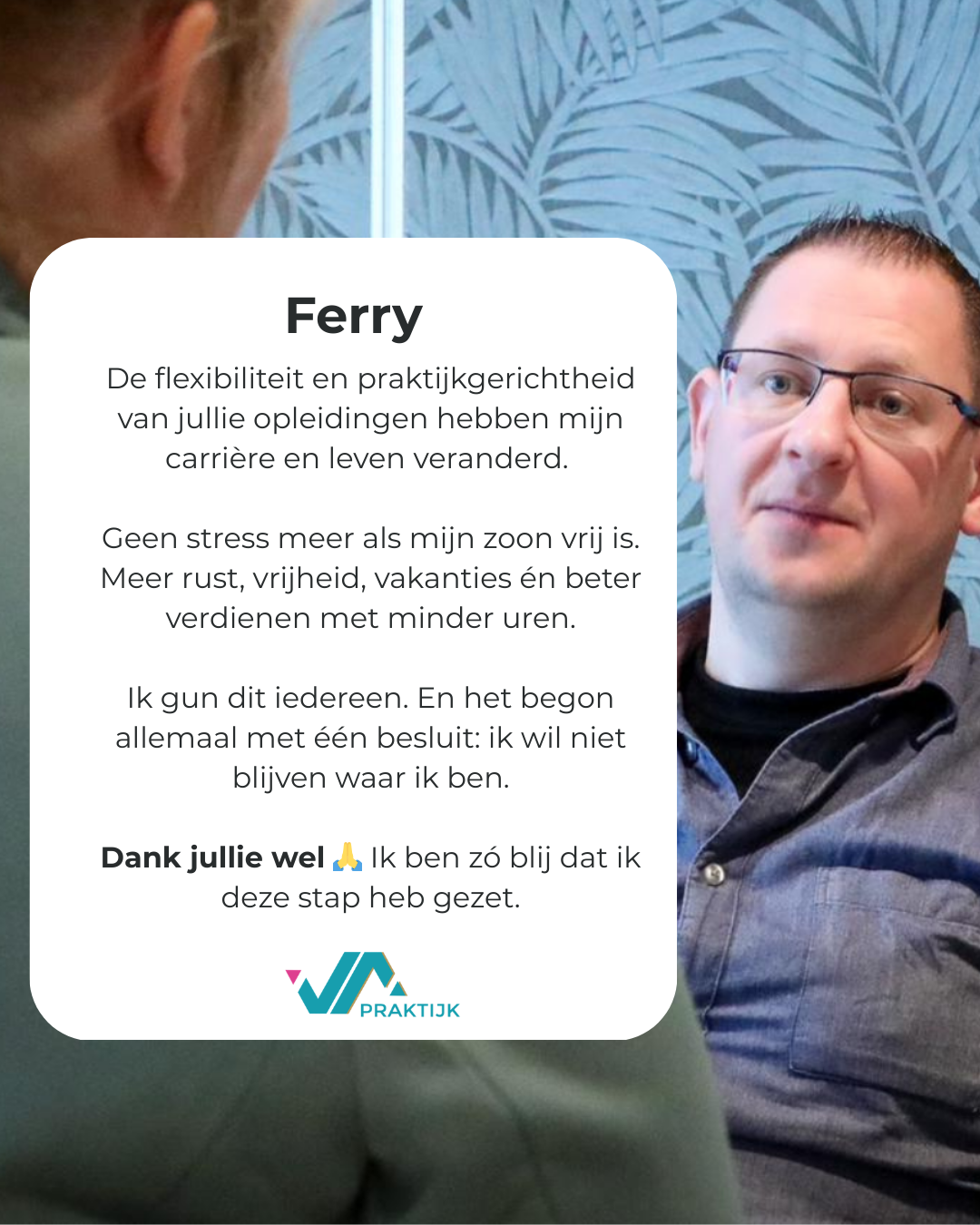Dan ontvang je binnen 14 dagen je geld terug. Deze belofte durven wij te maken aangezien we al 300+ enthousiaste cursisten hebben mogen verwelkomen die de opleiding met een succes hebben afgerond. Dit omdat het praktisch en persoonlijk is.