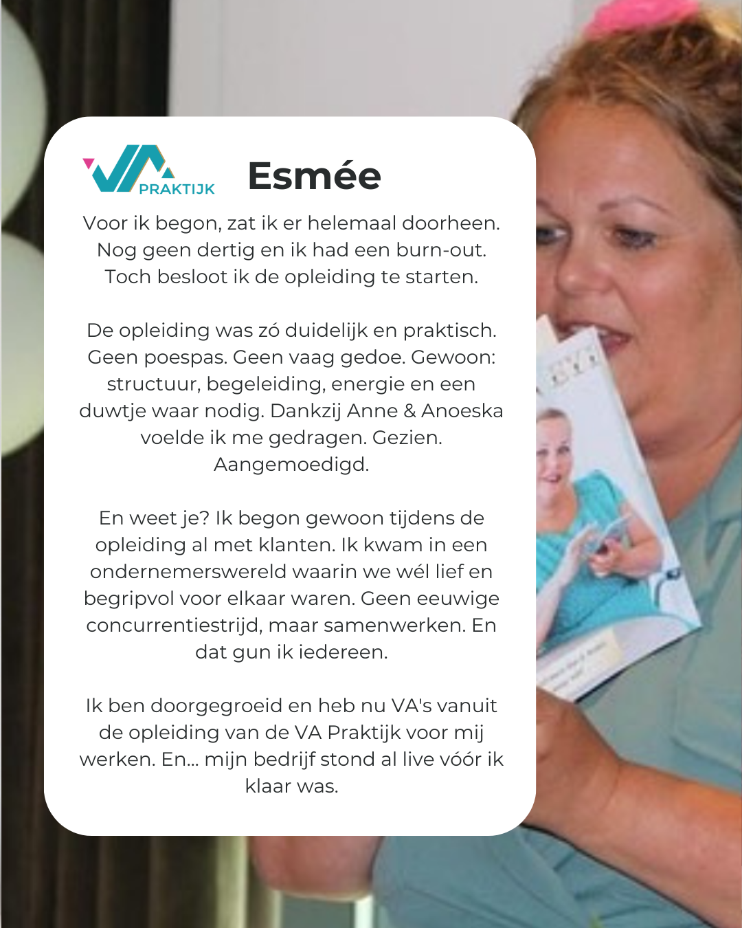 Dat dachten wij ook. We hebben nog nooit zo’n warme, bijzondere groep mensen om ons heen gehad als VA’s. Opdrachten doorspelen, wekelijkse Q&A's (buiten de vakanties om), samen aanpakken, met elkaar naar live dagen gaan… Je komt in een warm bad. Ook adviseren we iedereen minimaal 2 buddy’s en we zien dat die online zo eens in de twee weken afspreken en soms ook nog live eens per kwartaal.